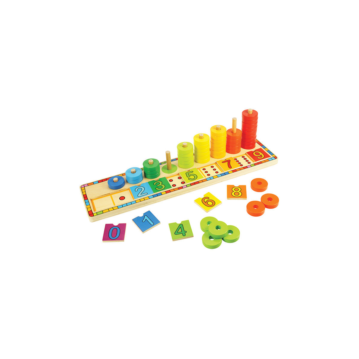 Get a head start on the fundamentals of math and counting with the Bigjigs Toys Learn to Count stacking toy! This delightful wooden toy acts as a fun introduction to mathematics and counting from an early age; recommended for ages 2 years and up. Hands-on and stimulating, Learn to Count offers a fun way for little ones to learn to count from 0 to 9. Our stacker is simple & traditional, with many enriching activities that little ones will love! As they stack each of the pieces onto the pegs, they'll be able to count out loud, '1, 2, 3, 4' & so on. An educational powerhouse, this 55 piece set includes 45 colored pieces and 9 numbered tiles, all of which are brightly colored and sure to keep children engaged!