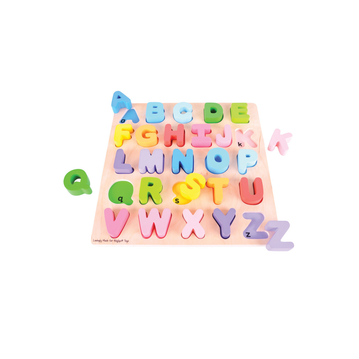 Learning the alphabet and how to spell need not be daunting with the help of this brightly colored wooden puzzle. Each individual letter is color coordinated with its base slot to help develop recall and recognition skills. Each chunky wooden puzzle piece is generously sized to make it easier for little hands to lift, grasp, examine and replace. Helps to develop dexterity, matching skills and concentration. The wooden base boards of Bigjigs Toys puzzles are printed with images or colors to aid the learning process and add educational value. Made from high quality, responsibly sourced materials. Conforms to current ASTM and CPSIA safety standards. Age 18+ months. Measures 11" x 11" x 1-1/2".