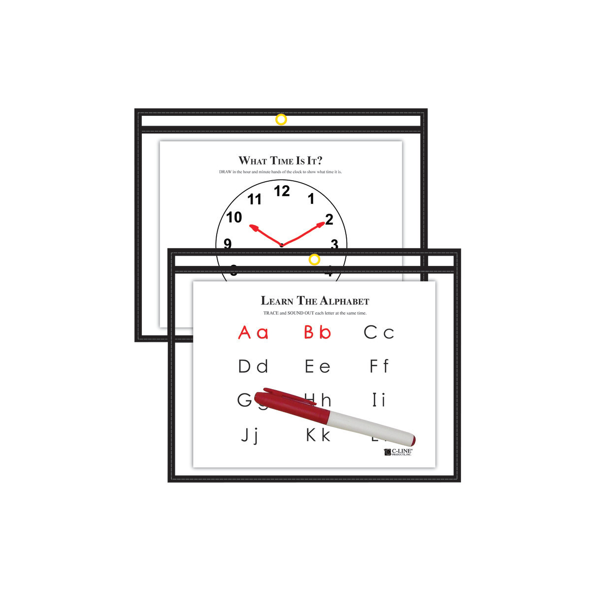 Practice math problems, letters, writing skills and more with these super-heavyweight 12 x 9 reusable dry erase pockets that are open on the long side.