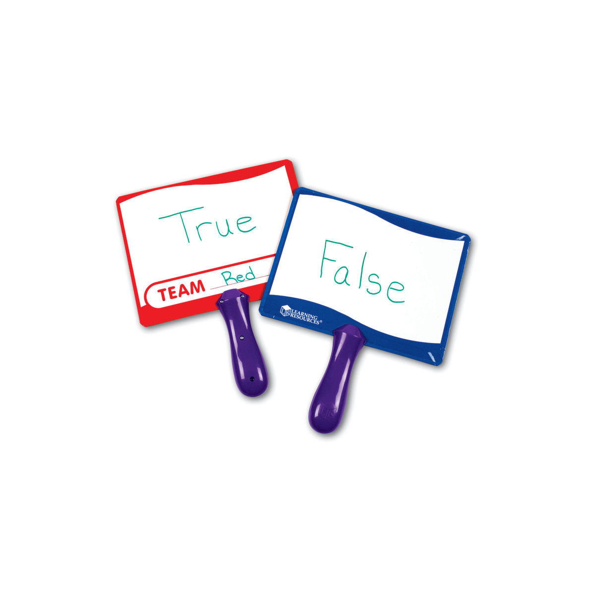 Students love "shouting" out their answers with these double-sided dry-erase boards. The versatility of this board provides teachers, of all grade levels, a fun way of learning in their classroom. Use this board for anything; classroom quizzes, classroom/team games, props in plays, quick answers to teacher questions. Board provides immediate feed back to teachers so they know if their students comprehend the lesson. Sets of 10 boards can be used across the curriculum for everything from class voting to quick-response team games. Five each in red and blue for quick visual team differentiation. Boards measure 8" x 6", with 4" easy-grip removable plastic handles. Grade 1+
