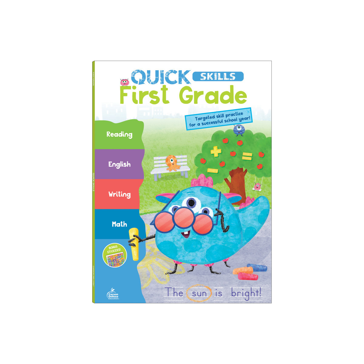 Support your child's education with Carson Dellosa's Quick Skills 1st Grade Workbooks All Subjects that help prepare your first grader for 1st grade math, language arts, reading comprehension, and writing success. 1st grade workbooks are a great way for children to practice essential skills such as adding, subtracting, parts of speech, handwriting practice, and more through focused practice. Addition, subtraction, place value, and parts of speech are a few of the topics that are included in the 1st grade book to help inspire learning in your child's 1st grade homeschool curriculum or classroom curriculum. The 80-page first grade workbook is sized at about 7.75" x 10.6"—giving your child plenty of space to complete each exercise. The first grade workbook includes an answer key to track student progress, as well as a sheet of stickers to reward your 1st grade student on a job well done after completing activities.