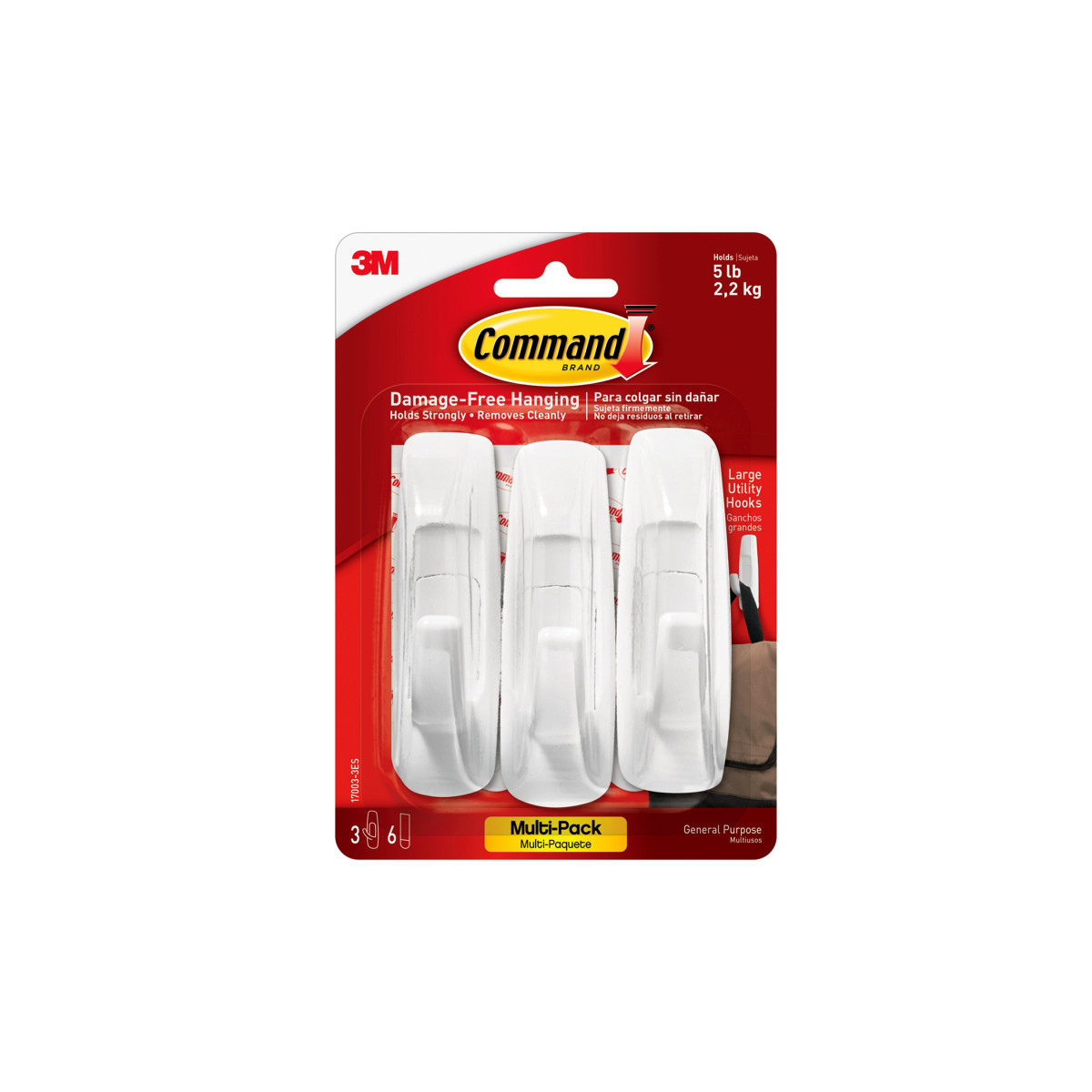 Life is easier when everything has its place. Organize your home damage free with Command Utility Hooks. Command Hooks let you hang what you want, where you want, without the hassle of tools and nails. Command Strips hold strongly on a variety of smooth, finished surfaces, and these adhesive hooks remove cleanly with no sticky residue or damage left behind. Now you can organize your home or office just the way you want with Command Utility Hooks. Each hook holds up to 5 lbs. Each pack includes 3 hooks and 6 adhesive strips. Grade PK+